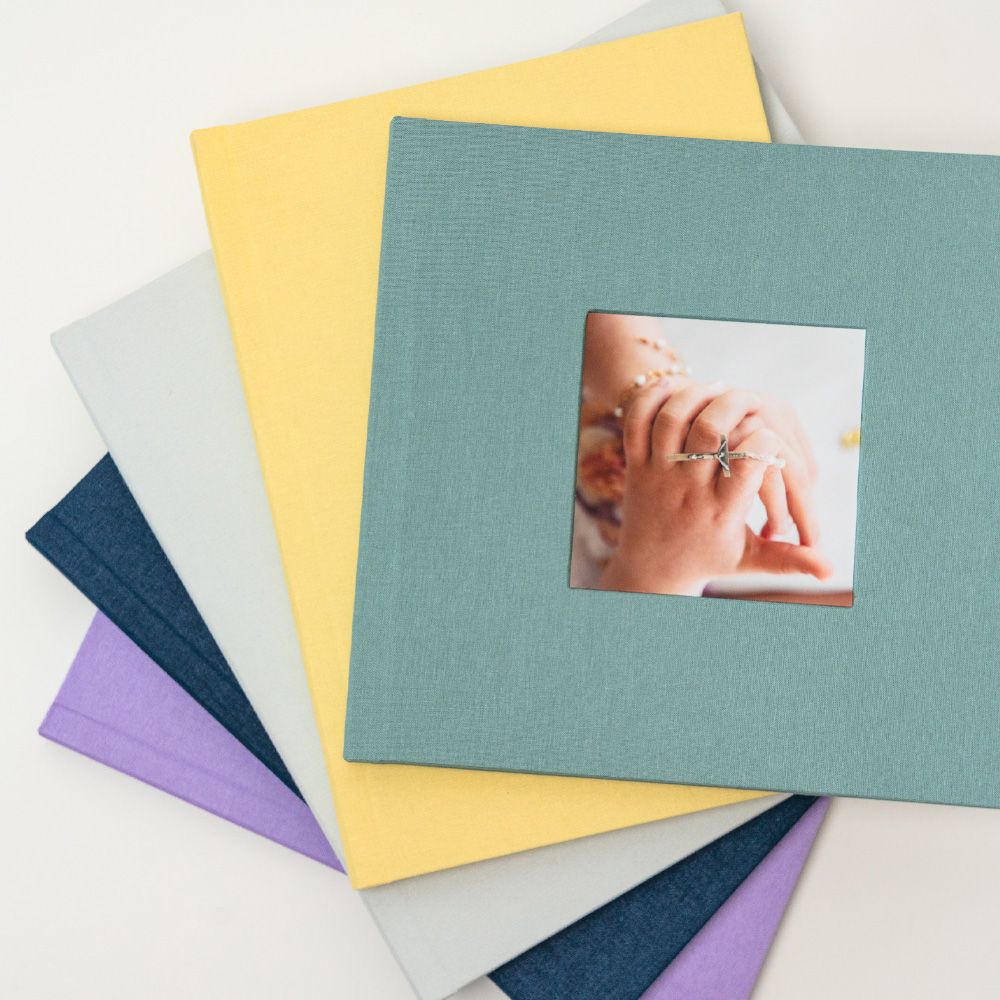 No modelo Cameo, a capa abre uma janela para a emoção. A tua fotografia favorita é integrada de forma permanente na capa em tecido, criando um leve relevo que a transforma no coração do álbum e num convite imediato para descobrir as memórias que guarda no interior.